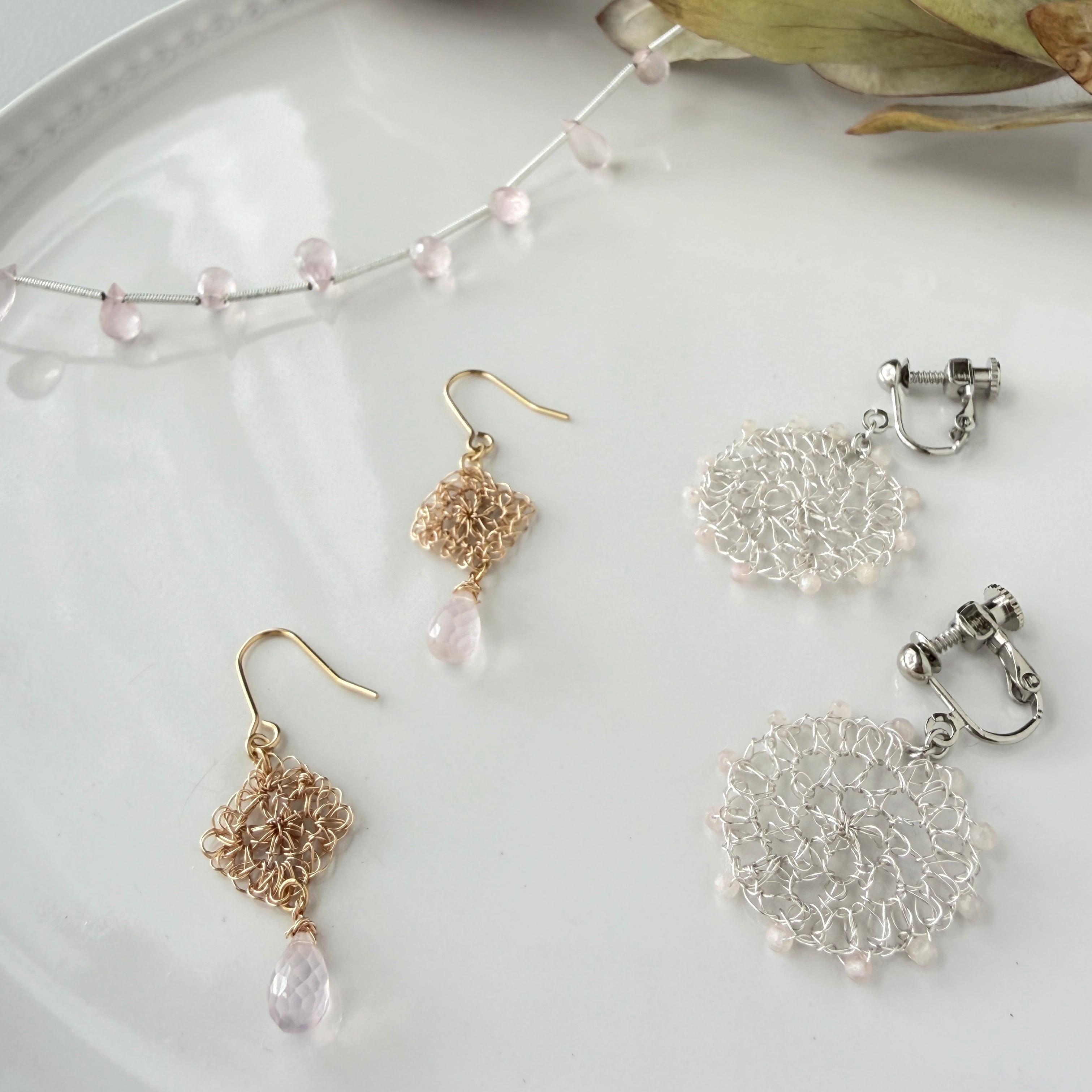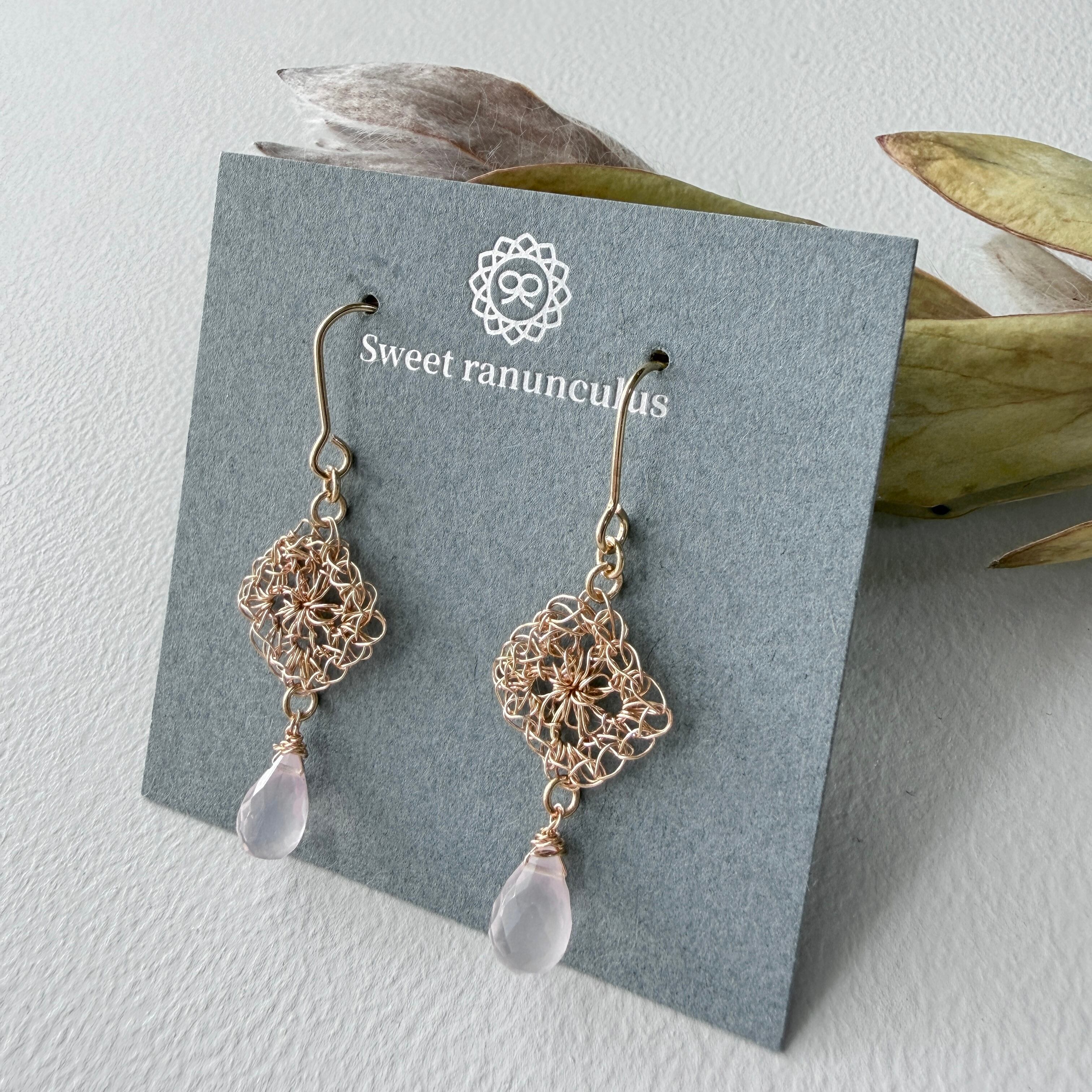 しずく型のローズクォーツを使用した耳飾りは、ワイヤーで編まれた四角いモチーフと組み合わせています♡