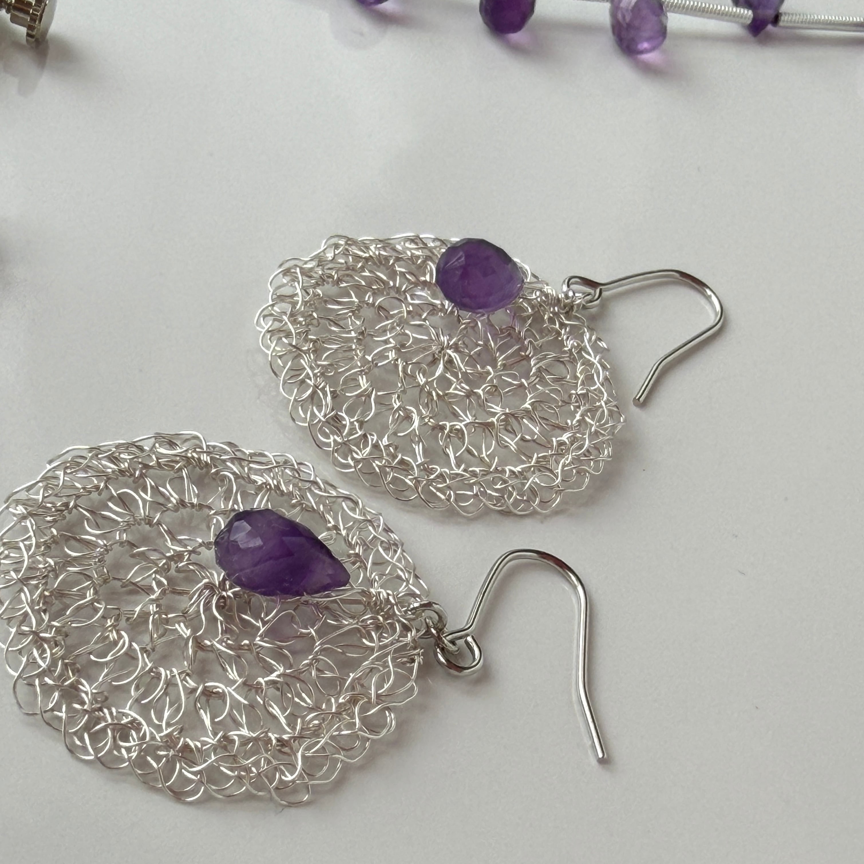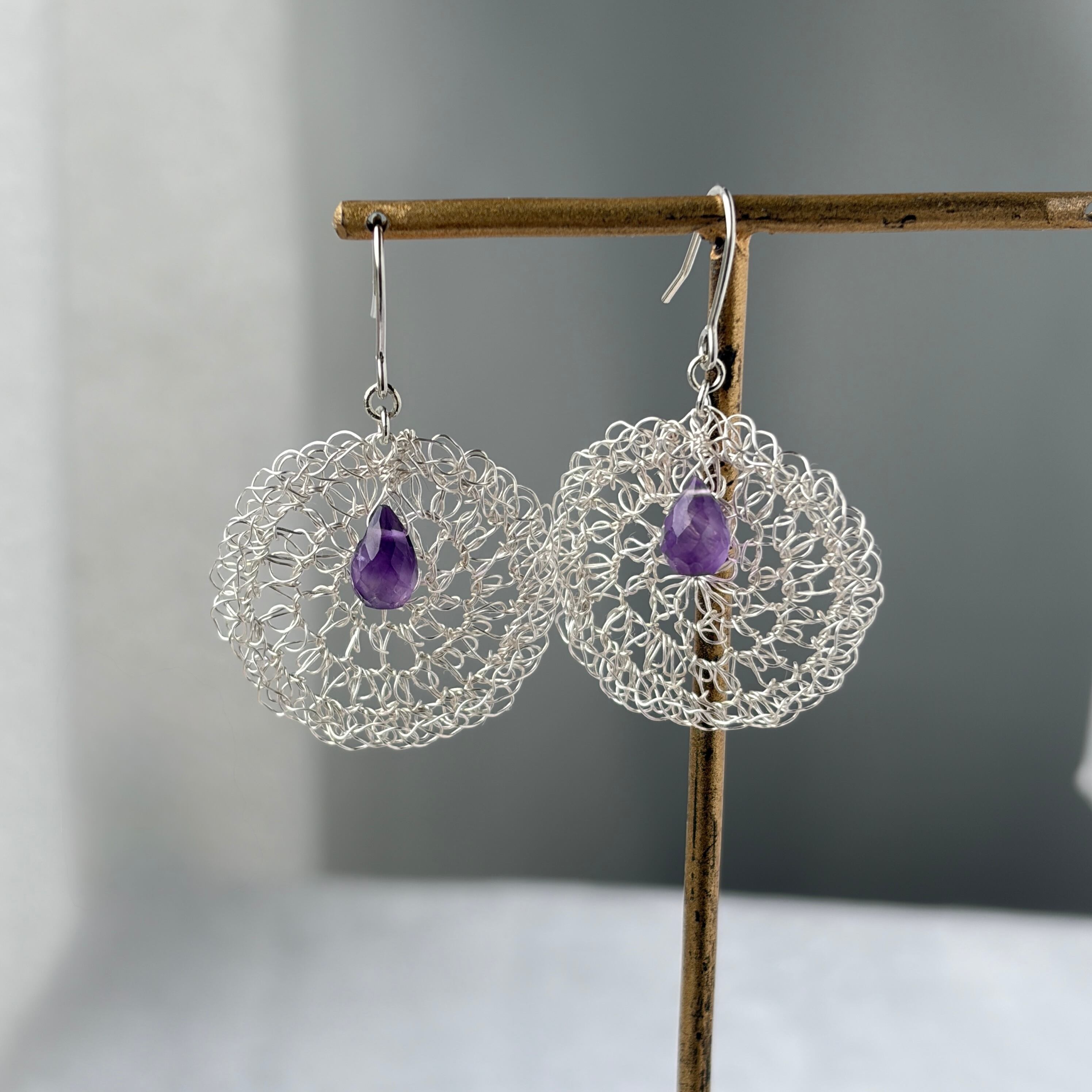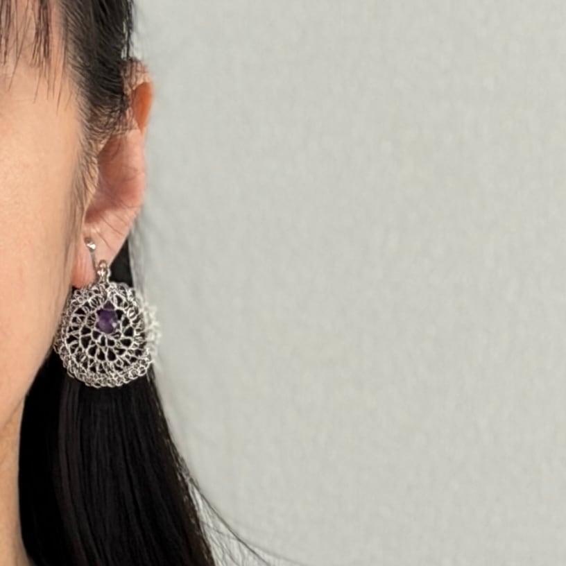 しずく型のアメジストに、ワイヤークロッシェで編んだまるいモチーフを合わせた耳飾りです。