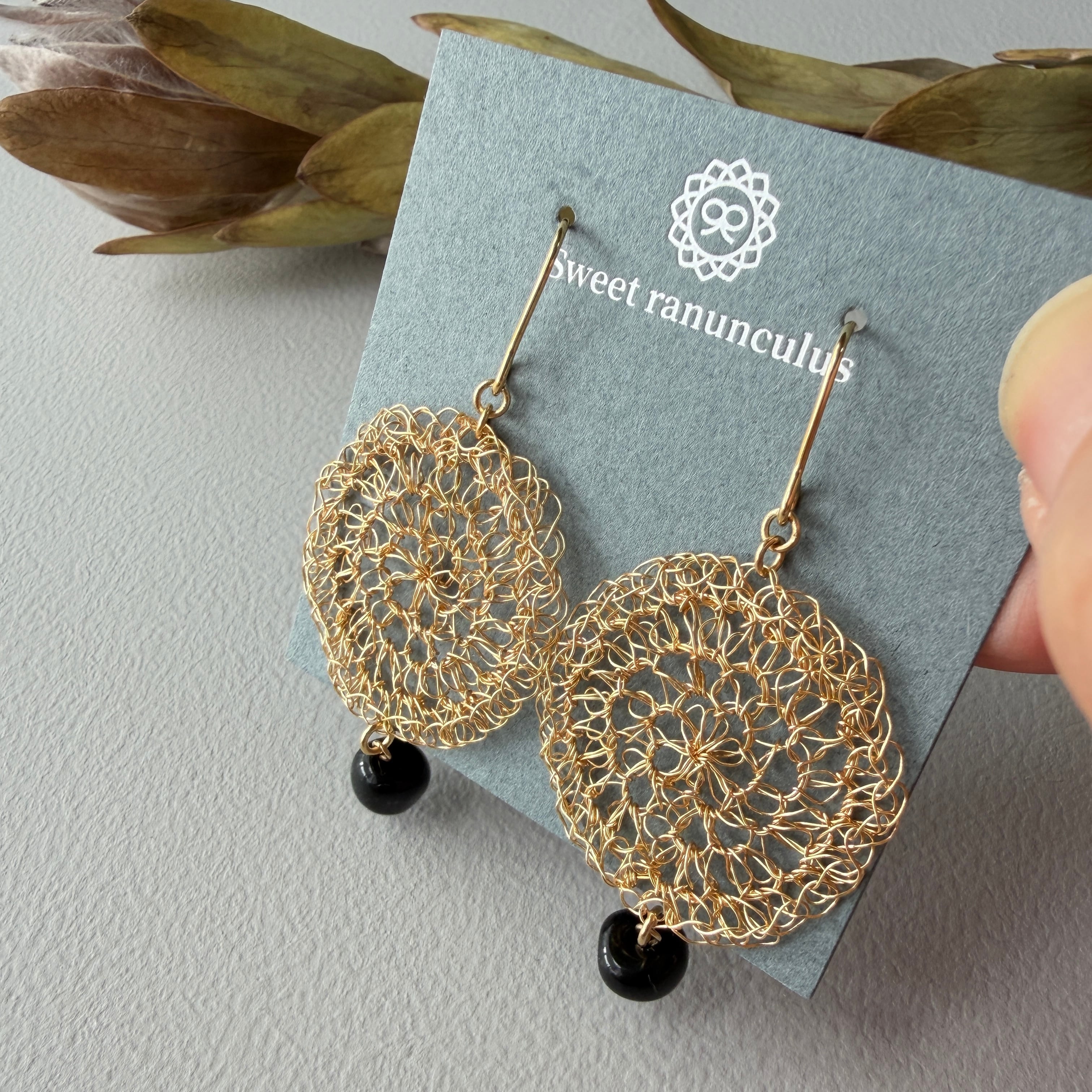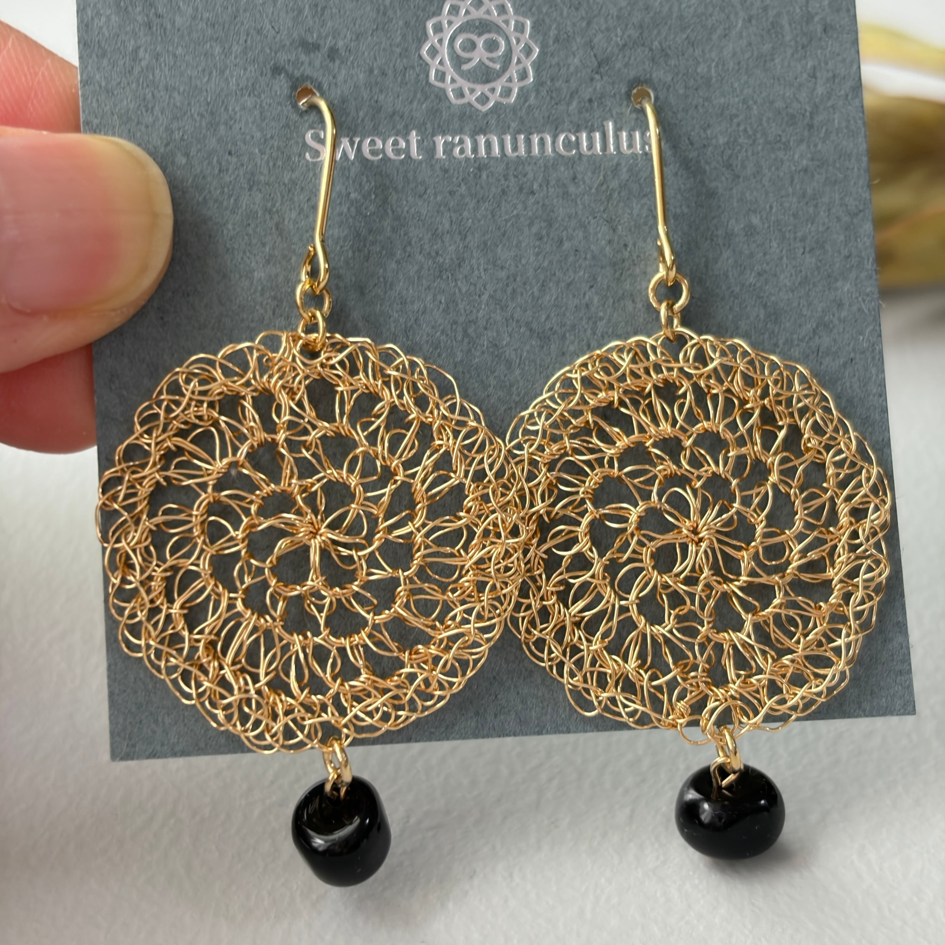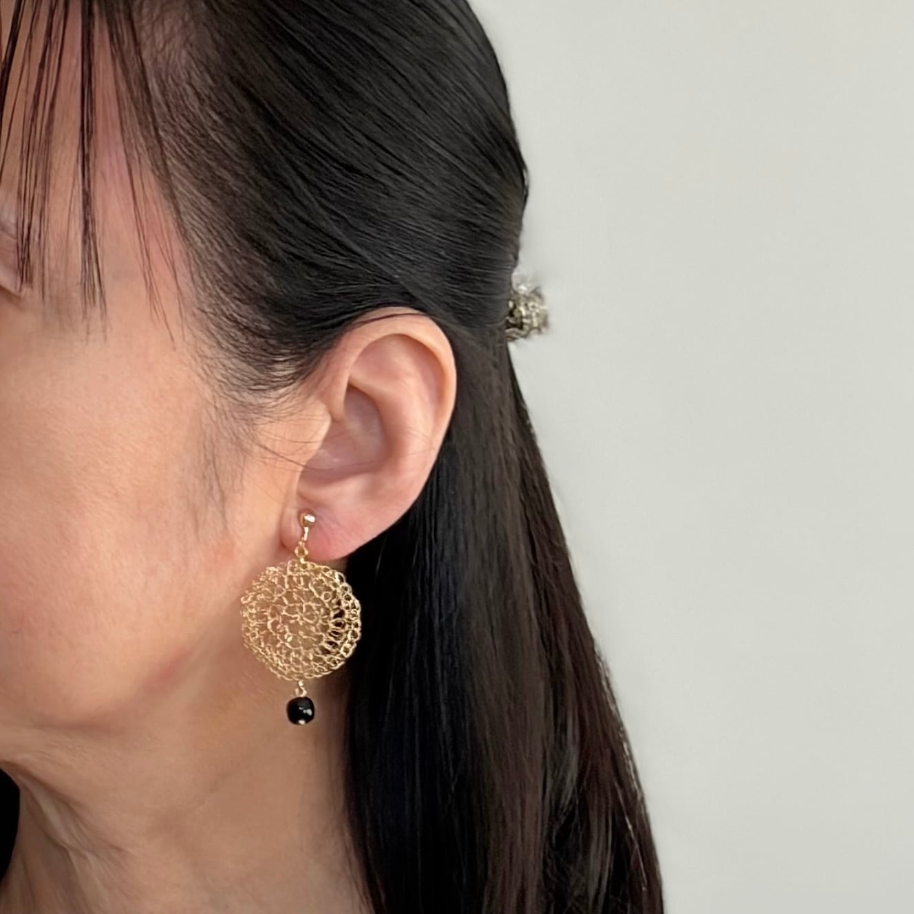 ワイヤーをかぎ針であむワイヤークロッシェの技法を用いて、ゴールドワイヤーでレースの様に編んで作った丸いモチーフに、天然石オニキスを合わせたピアスです。