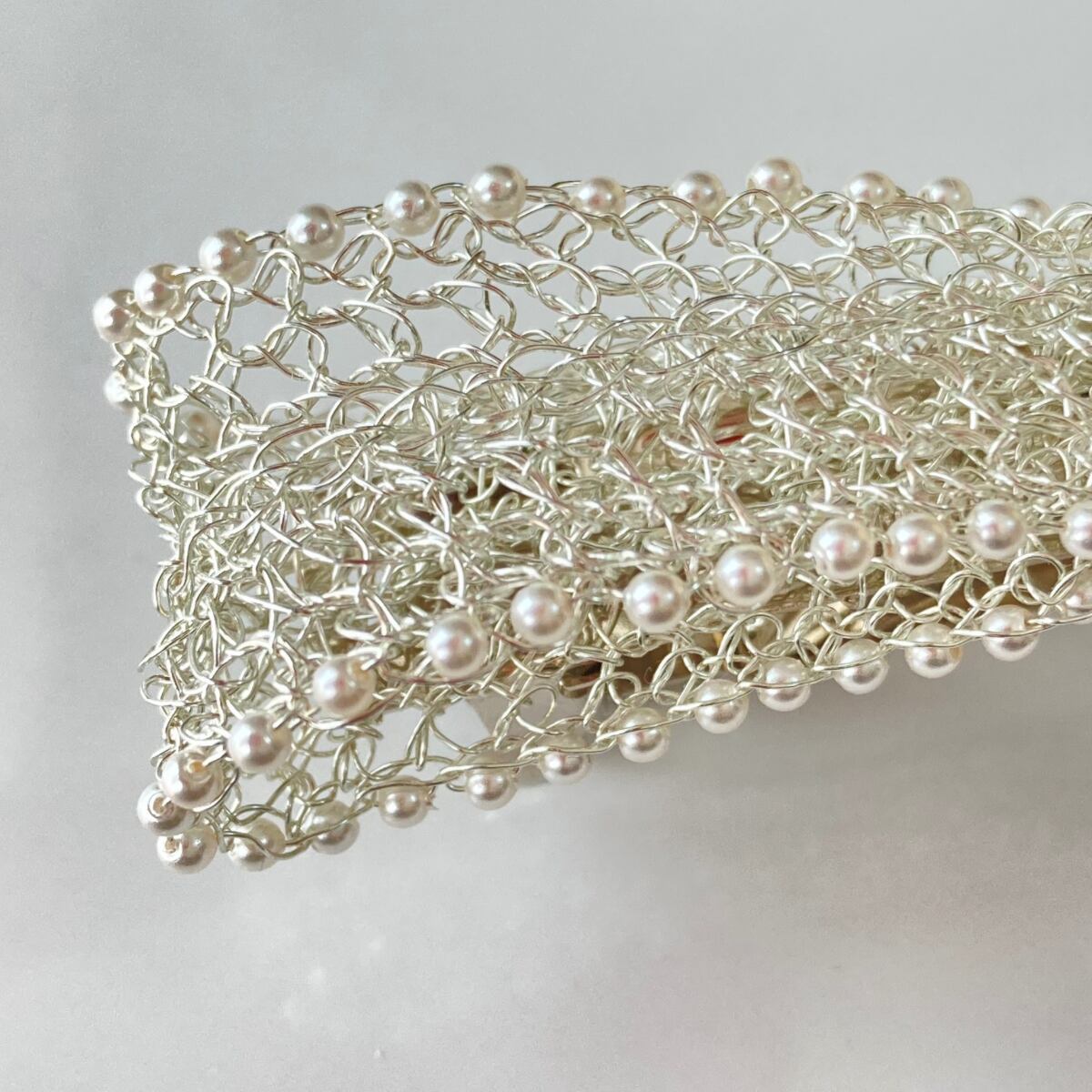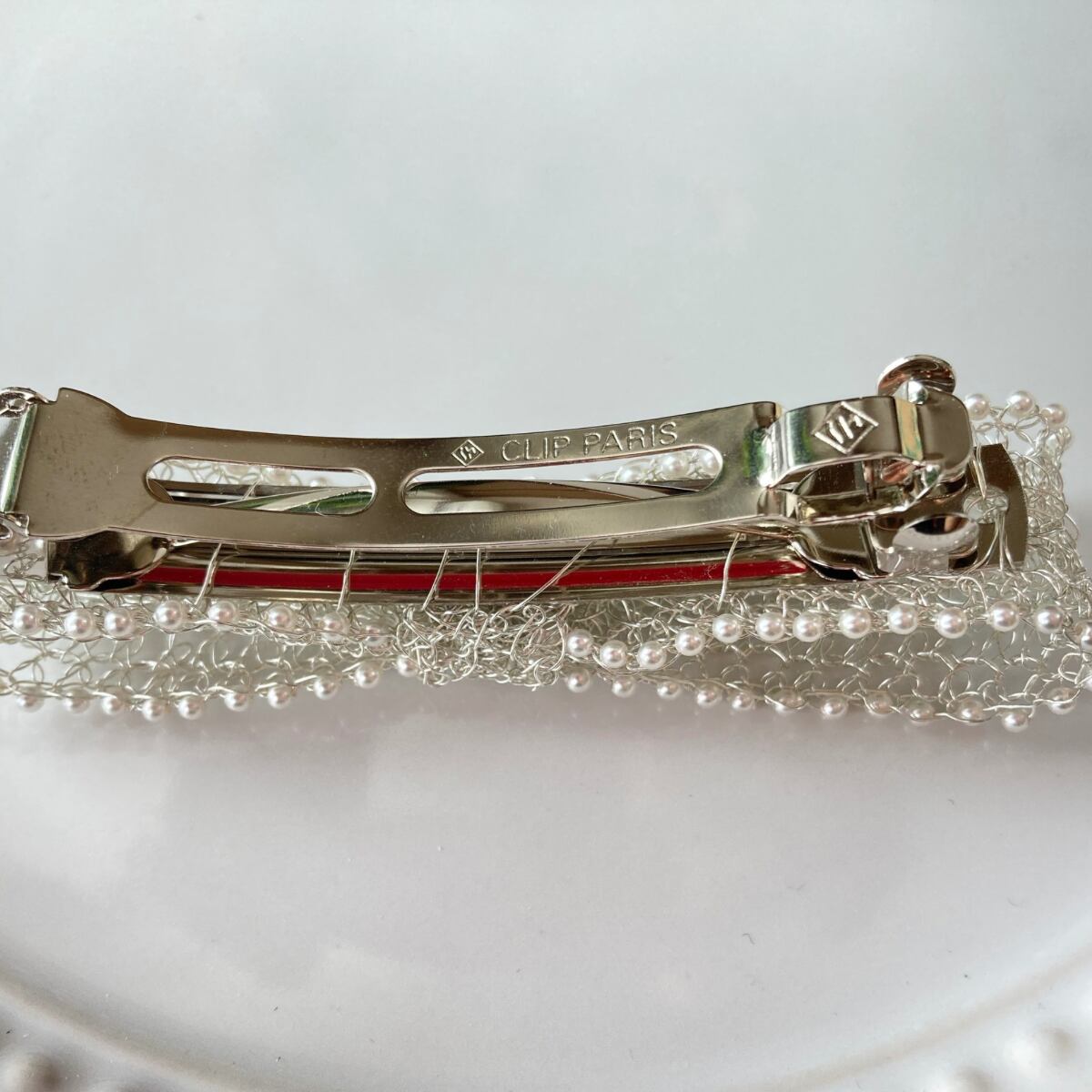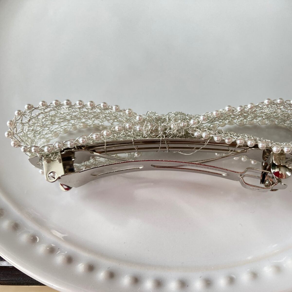 ワイヤーをかぎ針であむワイヤークロッシェの技法を用いて、シルバーワイヤーにクリスタルパールを編み込みながら、レースのように作ったリボンの形がかわいいバレッタです。