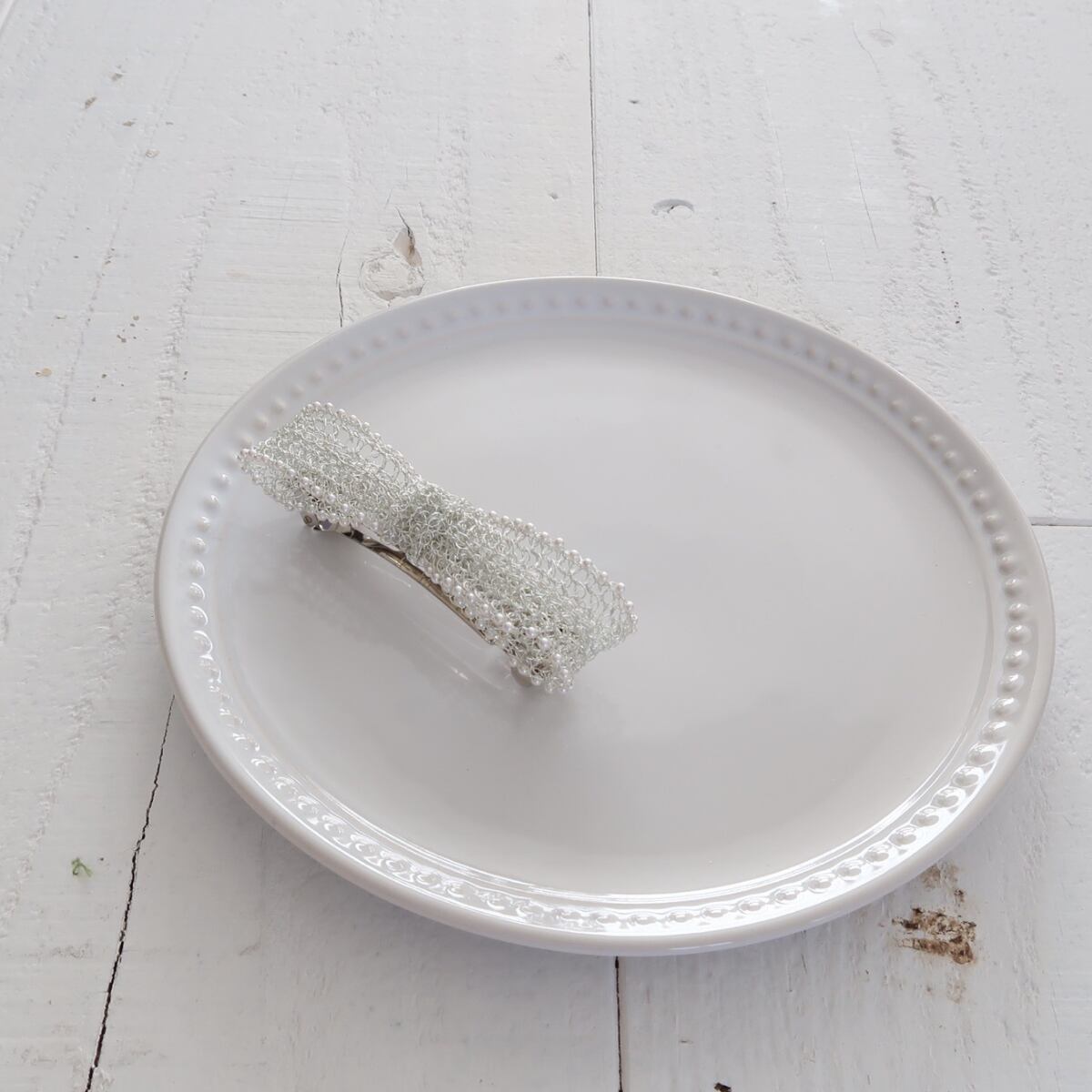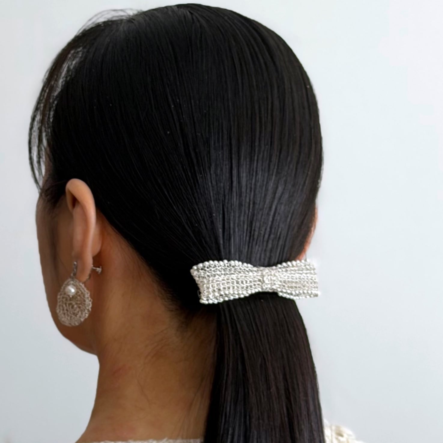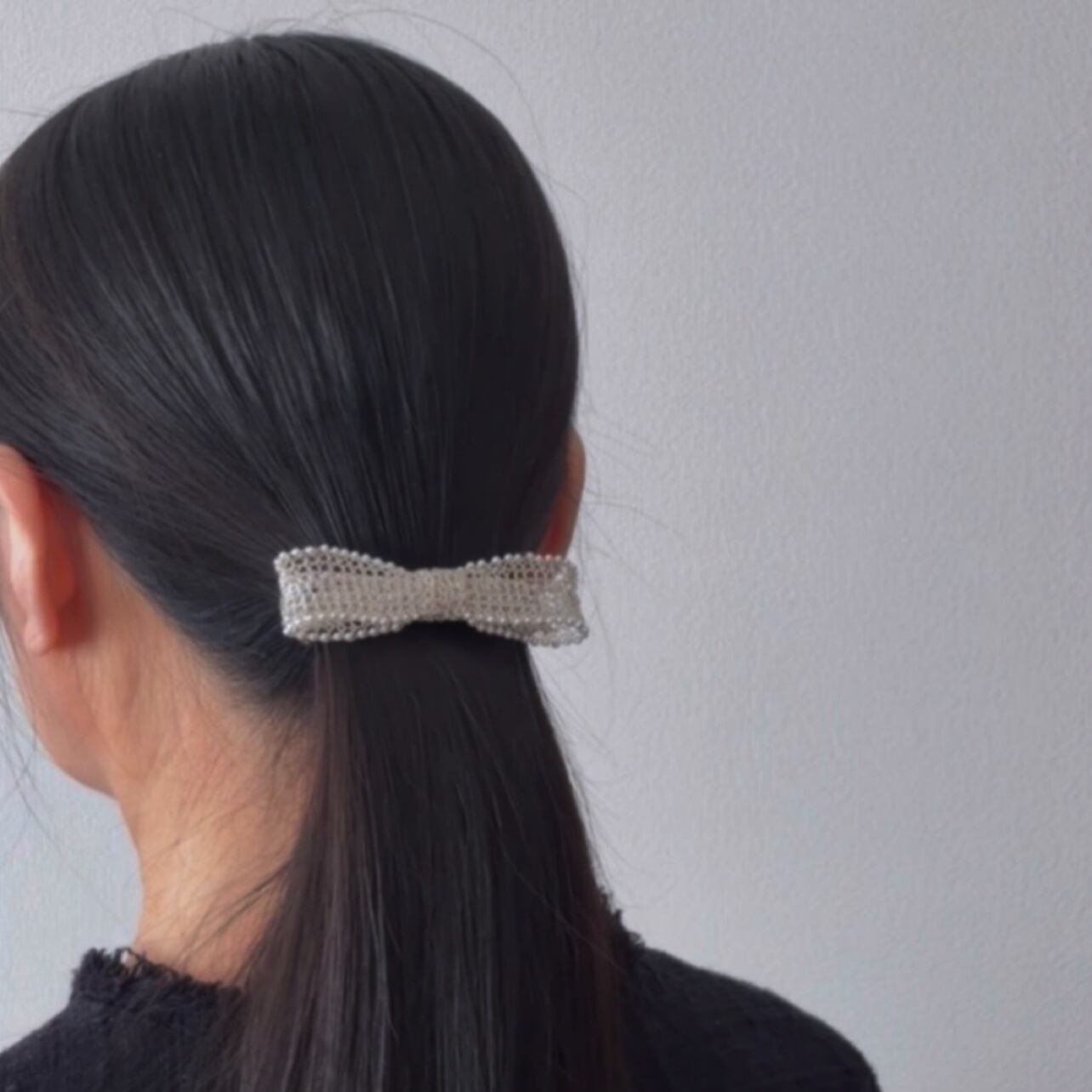 ワイヤーをかぎ針であむワイヤークロッシェの技法を用いて、シルバーワイヤーにクリスタルパールを編み込みながら、レースのように作ったリボンの形がかわいいバレッタです。