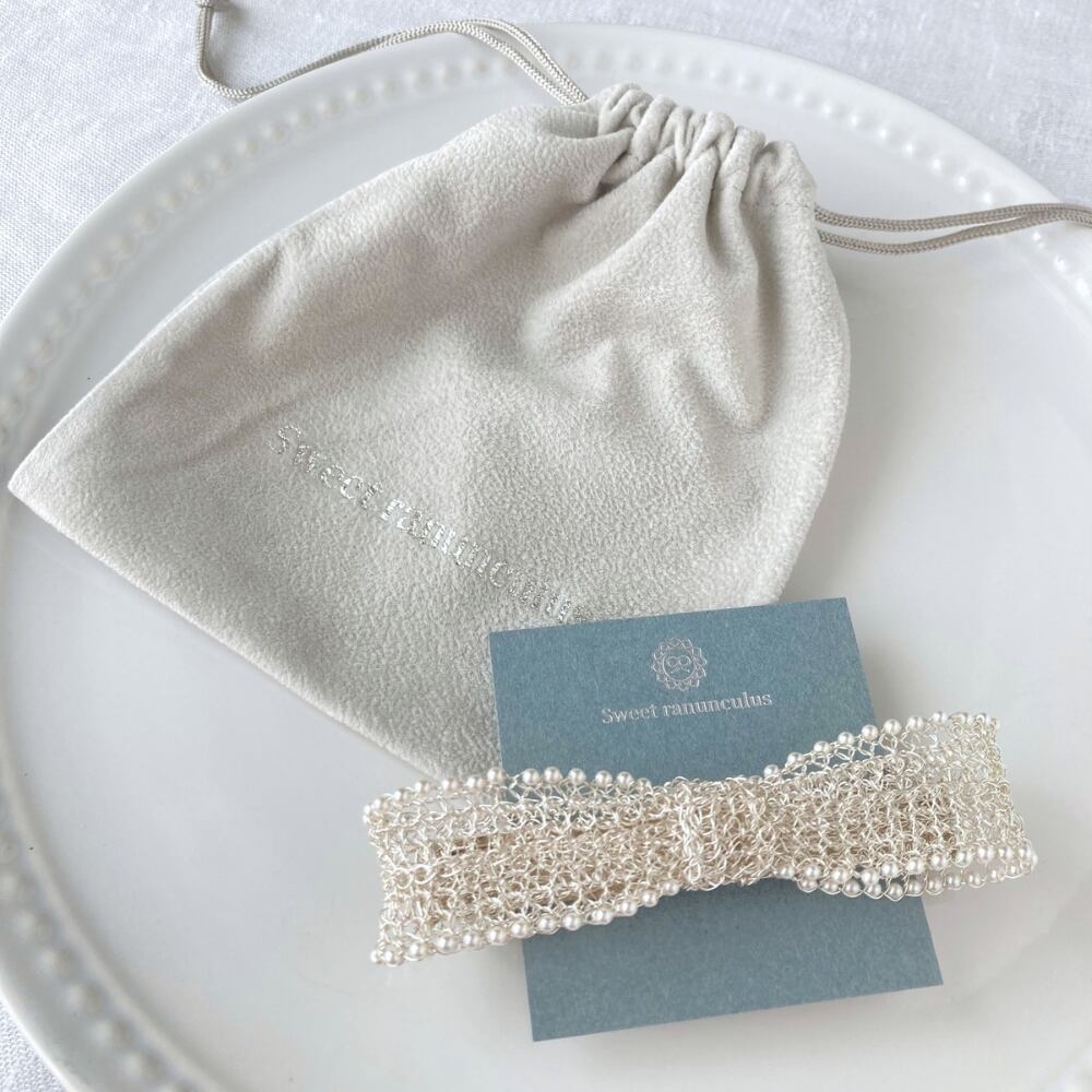 リボンの形はふっくらしていて、またたくさんの小さなパールビーズで可憐な仕上がりとなっています。